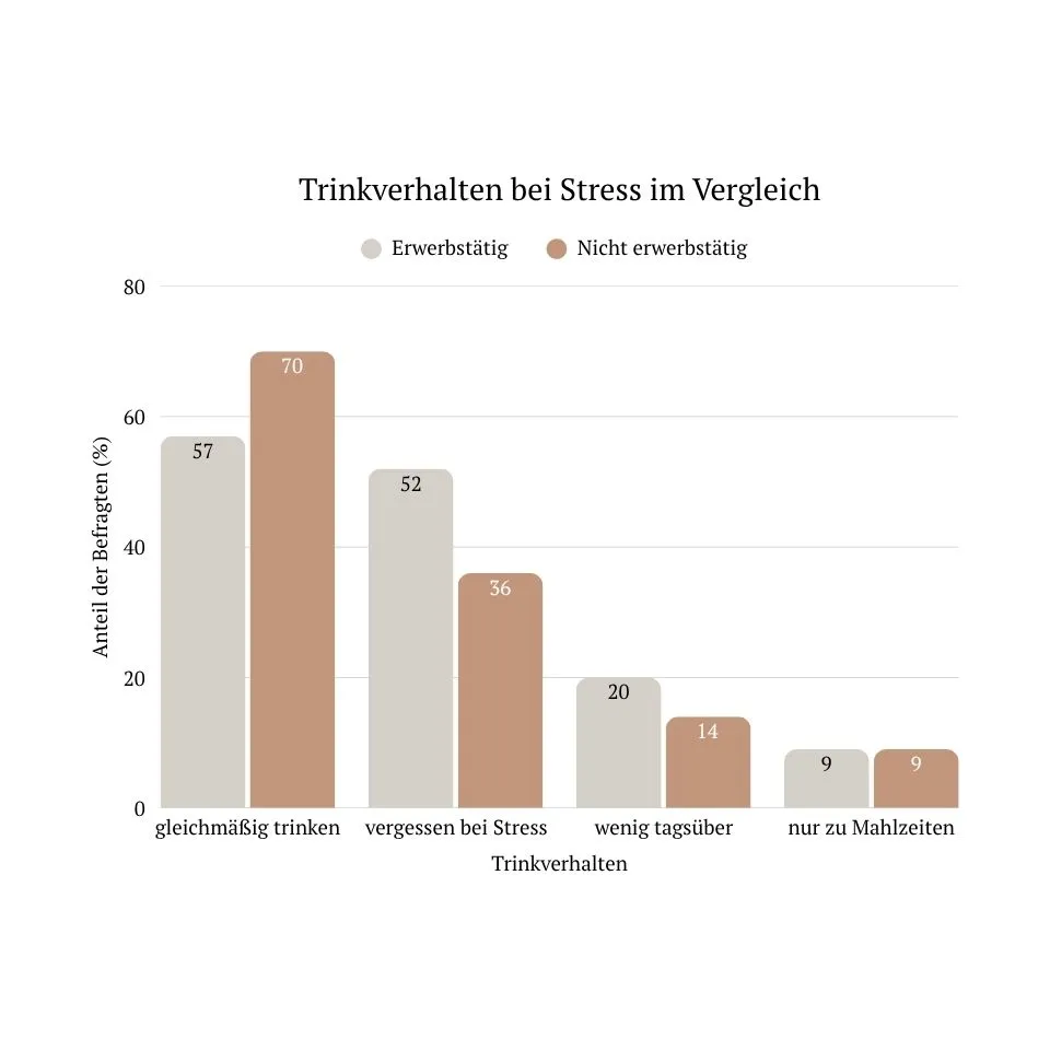 Die Daten zeigen deutlich: Besonders im Arbeitsalltag geht regelmäßiges Trinken schnell unter. Über die Hälfte der Erwerbstätigen gibt an, bei Stress häufig zu vergessen zu trinken.